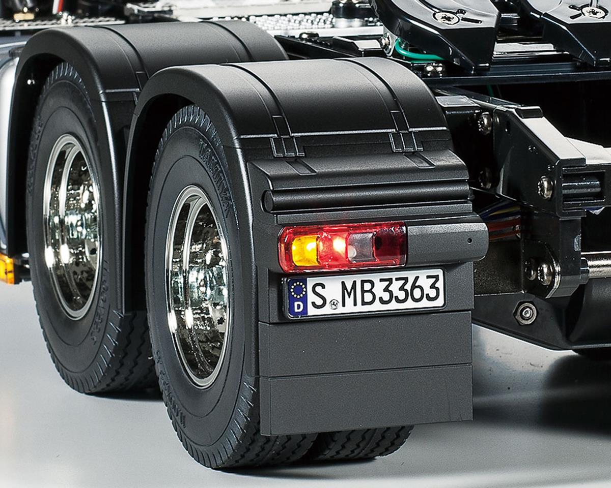 This is a highly accurate 1/14 scale radio control model that recreates the Mercedes Benz Actros 3363 3-axle truck. The Actros series debuted in 2011 and was named 2012 Truck of the Year. Powered by a 15.6-liter inline-6 turbocharged diesel putting out a max of 630hp, the actual 3363 can haul up to 250 tons!