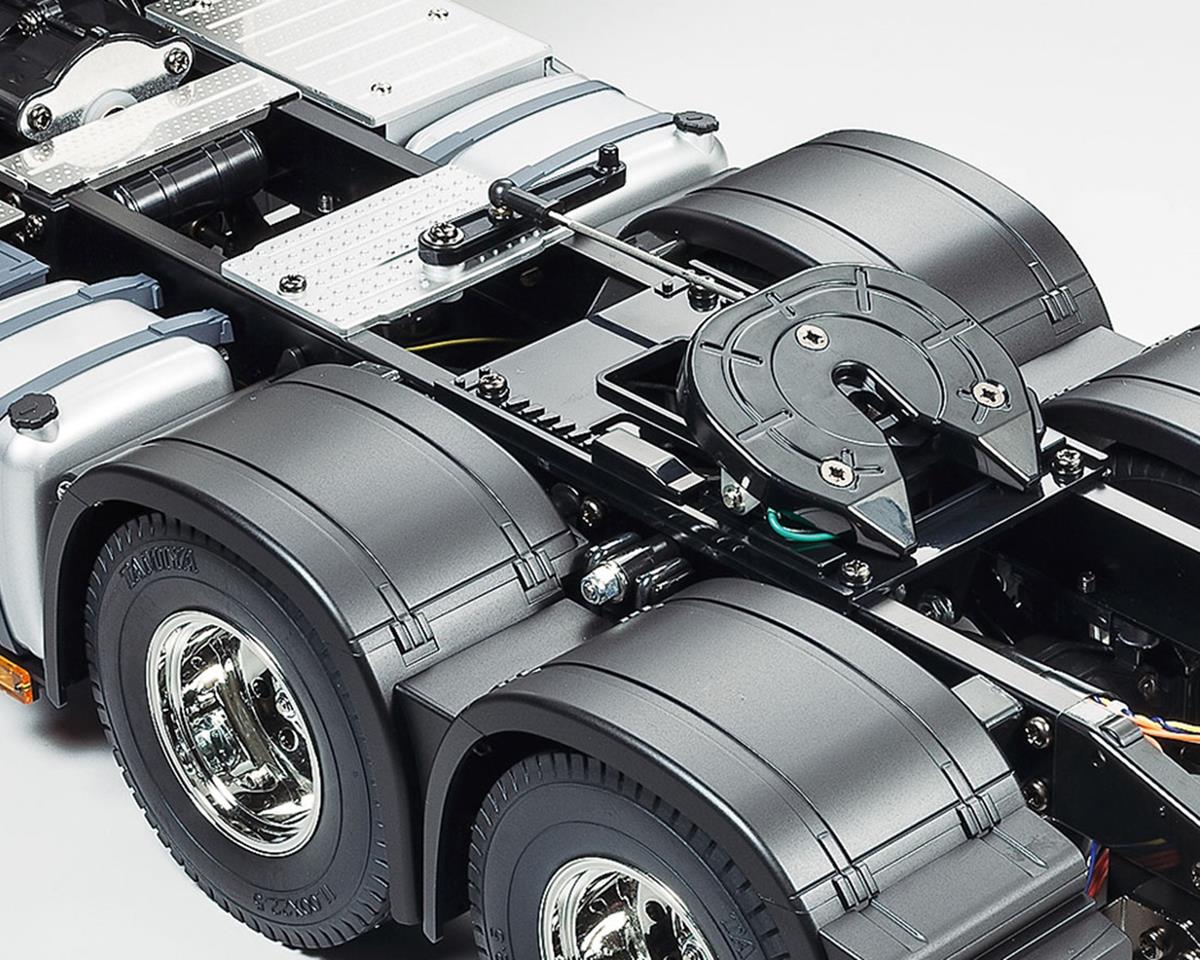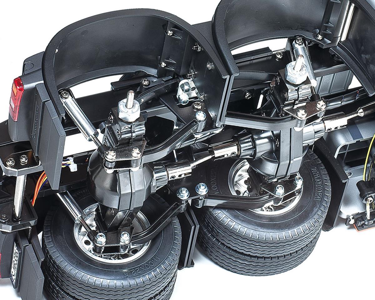 - The tried and tested Tamiya 3-axle chassis utilizes a tough ladder frame with aluminum side channels and resin cross members. A realistic drivetrain setup sees the front mounted motor powering twin rear axles.