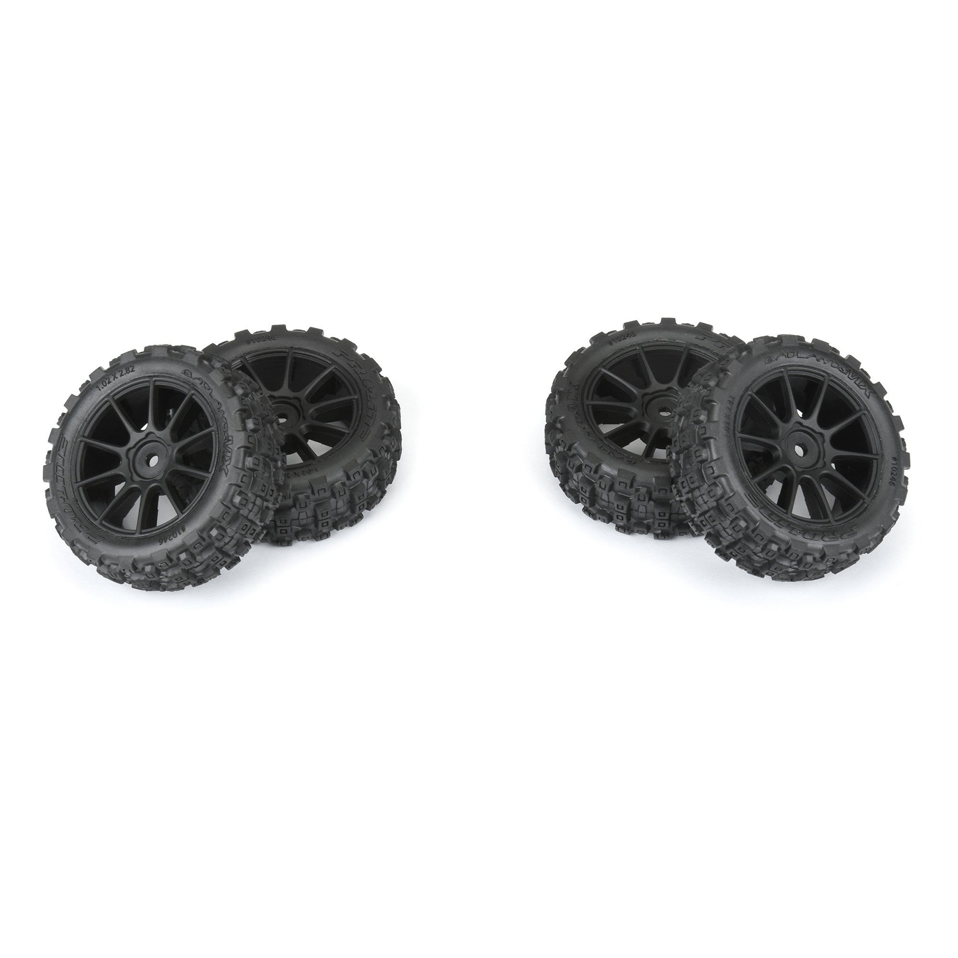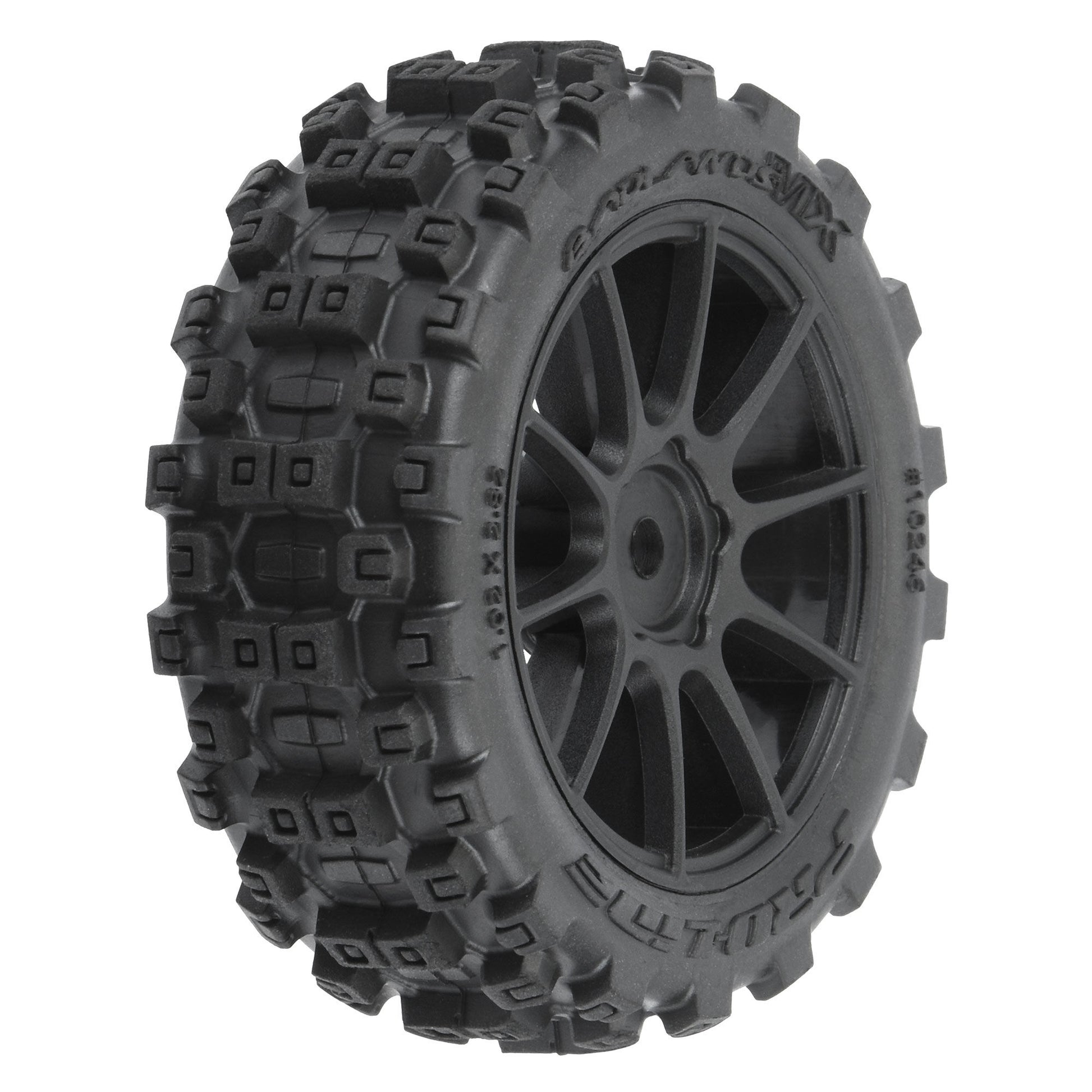 This is a set of Pre-Mounted Badlands MX Tires on Mach 10 Wheels for Typhon™ GROM. Pro-Line is taking the 1/8 Buggy tire and sized it down to small scale! Pro-Line Badlands tires are known for having sweet Motocross-inspired tread and the Badlands MX tires kick that up a notch with a Bigger and Bolder knobby tread that matches modern MX tire design. The Badlands MX is a true All-Terrain tire that will find traction on any surface but is best suited for loose & loamy dirt, mud, or grass. Just imagine your buggy throwing up huge rooster tails with these awesome looking tires!