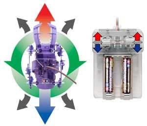 Take control of this Stag Beetle robot via the included 2-channel remote controller. The two controller sticks operate separate gearboxes, enabling forward/reverse, and left/right movement. The legs of the robot insect are linked to the head, allowing mandible clamping action as the robot moves. Easy to assemble kit does not require any cement, and both the robot and remote controller body are made from clear plastic material, which enables the internal mechanisms to be viewed.