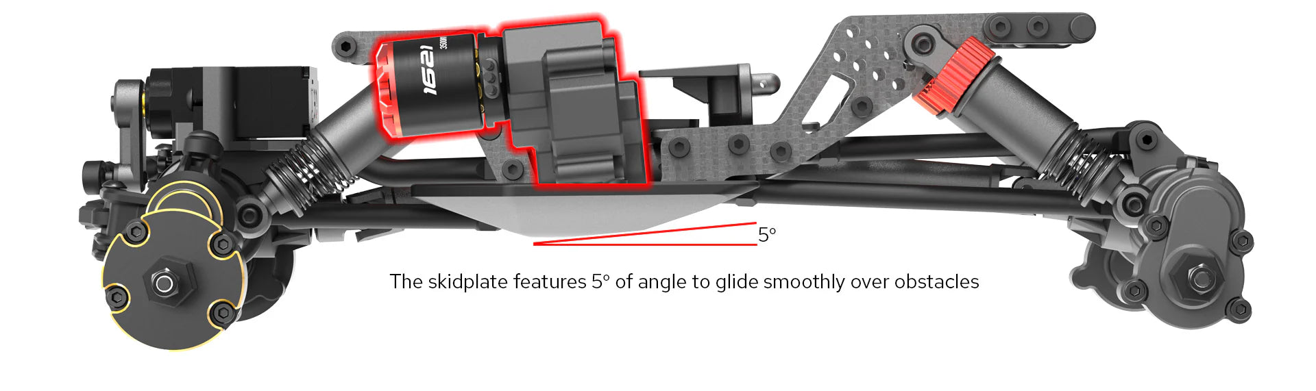 The Ascent-18 Apex features a carbon fiber low center of gravity chassis with aluminum bracing for balanced weight distribution. This lightweight yet durable frame enhances stability on rocky trails and steep inclines. Ball bearings throughout the drivetrain ensure smooth operation, reducing friction and improving overall responsiveness.