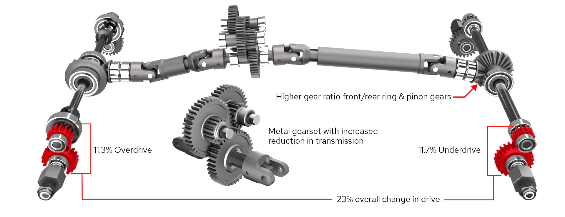 Equipped with high-steer portal axles, the Ascent-18 Apex gains improved ground clearance and a tighter turning radius. The front axles include upgraded brass outer portal boxes and differential covers, while overdrive gears and an enhanced ring and pinion gear provide better climbing power. These features allow the crawler to navigate obstacles with increased stability and control.