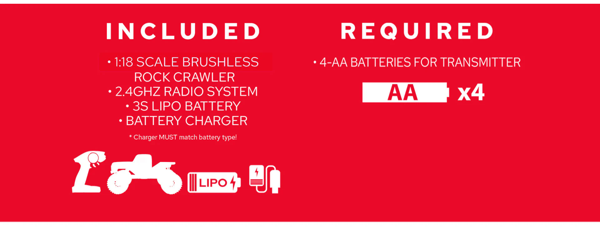 This crawler comes with a Hobbywing brushless motor and ESC, a metal gear micro servo, and beadlock wheels with aggressive 1.3-inch soft compound tires. The RTX-4C 4-Channel 2.4GHz Transmitter allows full control with adjustable trims and endpoints, while the 3S LiPo battery and USB charger make it ready to run right out of the box. Additionally, an optional two-piece body lets you run it as a cab only or add the included bed for extra customization.
