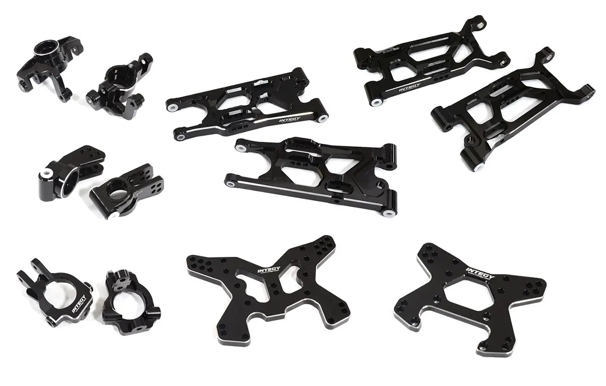 Each set includes the following parts: 2x Front Lower Arms, 2x Steering Blocks, 2x Caster Blocks, Front Shock Tower, 2x Rear Lower Arms, 2x Rear Hub Carriers, and a Rear Shock Tower.