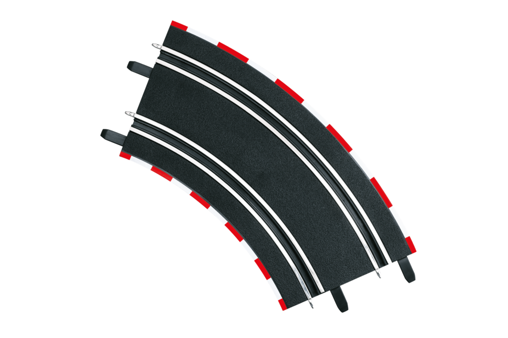 - The individual pieces have an incline of 45° – no big challenge for your slot car. But when assembled into a 180° corner you should be careful not to fly out of the corner with your car!