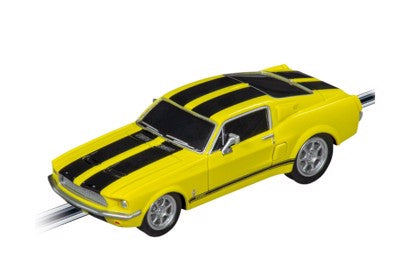 1:43 scale Ford Mustang '67 - Racing Yellow for Carrera GO !!. The Ford Mustang makes the eyes of all classic car fans light up. The car has been built by the American manufacturer Ford since 1964 and has achieved a true cult status today. The first models were based on the technology of the Ford Falcon and were available with numerous different engines. The predecessor of the Pony Car class gained fame through its use in many well-known films and has become a true legend. The yellow paintwork of the sports car underlines its striking design and magically attracts attention. A true classic! From 6 years.