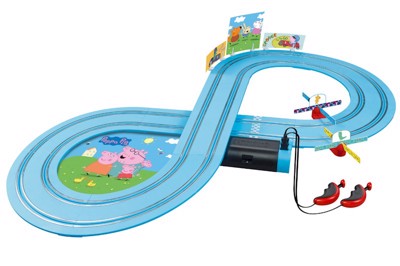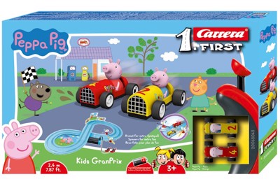Carrera FIRST 'Peppa Pig -Kids GranPrix' set guarantees tons of fun with Peppa Pig and her little brother George speed around the 2.4-metre racing circuit in their soapbox racers for gaming pleasure for drivers age 3 and up.