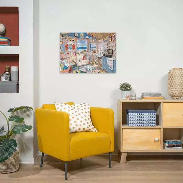 Take a deep, cleansing breath and enjoy this relaxed retreat from your hectic, too-much-to-do life! The compact yet efficient hut has all the comforts you need; a convertible couch, kitchen area and more. Gaze at the bright blue waves as they ebb and flow with soothing constancy. Of course, the captivating view seems to have distracted the lady’s attention from her lunch, and the visitor at the door may not wait for an invitation to partake. A fun puzzle for any beach-lover on your list!