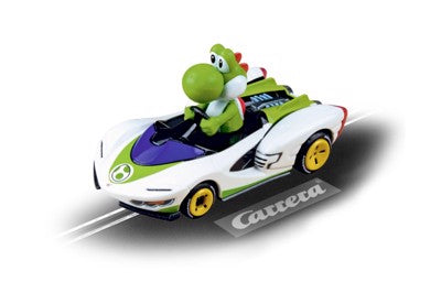 1:43 Scale Mario Kart - P-Wing - Yoshi. With its eye-catching design, Yoshi stands out on your race track! The green-and-white hero with a big nose and orange shoes is already eagerly waiting for the starting signal at the starting line with his speedster in the colours white, green and blue. 6 years+