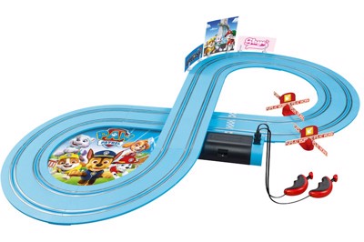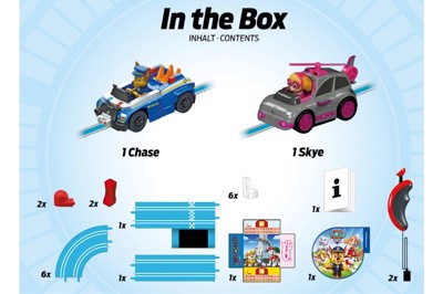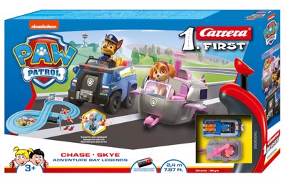 Let's go to Adventure Bay! Chase and Skye join forces in the Carrera FIRST 'PAW Patrol. These canine pals love to zoom around the 2.4-metre blue race circuit and guarantee fun and games for junior racers aged 3 years and up. Chase speeds along the racetrack in his police car, while Skye rockets around the Carrera course in her helicopter.