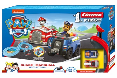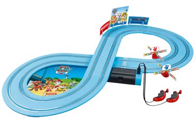 This children's race track set features Chase and Marshall from PAW Patrol. In this track Set the clumsy Dalmatian Marshall, with his fire truck and the sporty shepherd dog Chase, with his police car compete against each other. 1:50 scale Carrera FIRST series features a spinning top for extra fun. Set includes two child-friendly speed controllers. Track size is 2.4 metres.