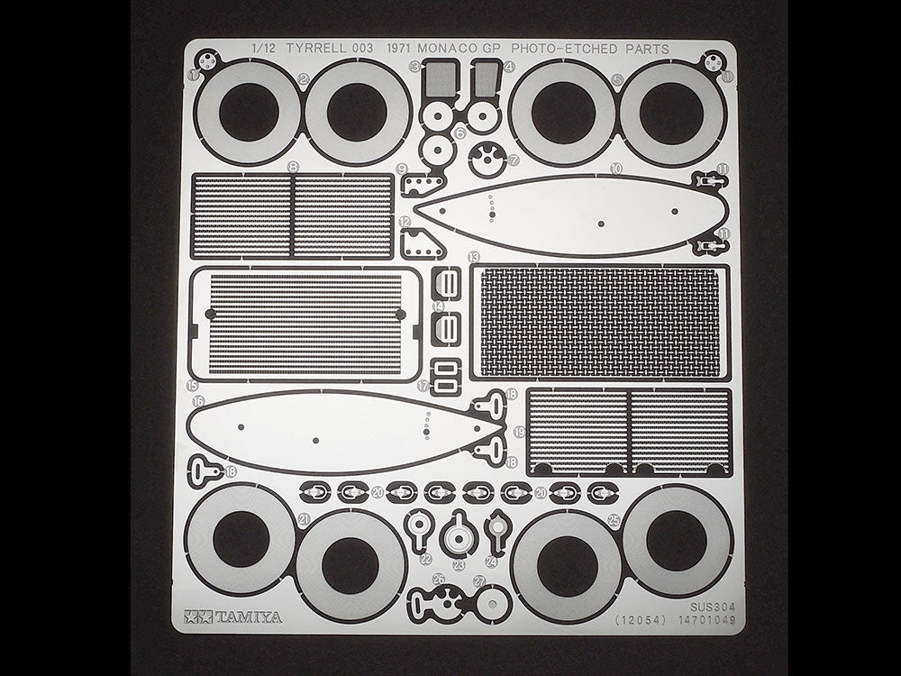 The Tyrrell team made their Formula One bow in 1968 using the Matra Ford and quickly achieved excellent results, with a drivers' championship for Jackie Stewart the next season. From the 11th race of 1970 in Canada, the team debuted the in-house designed 001, which paved the way for the 003 and 002 cars piloted in 1971 by Stewart and François Cevert respectively. While a unique integrated front wing and nose with radiator just below caught the eye, the 003 utilized an otherwise orthodox, reliable setup. Stewart achieved 6 wins in 11 races including the Monaco GP, more than enough for that season's drivers' and constructors' titles. Now, the car is immortalized in Tamiya 1/12 scale.