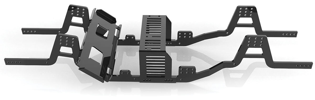 It all starts with a powder coated 3mm ladder frame chassis, designed and tuned by BPC Custom Chassis and Two Guys Trail Gear. The addition of the low slung forward mounted battery tray and steel electronics bridge create a highly tunable platform that performs alongside customized crawlers costing twice as much.