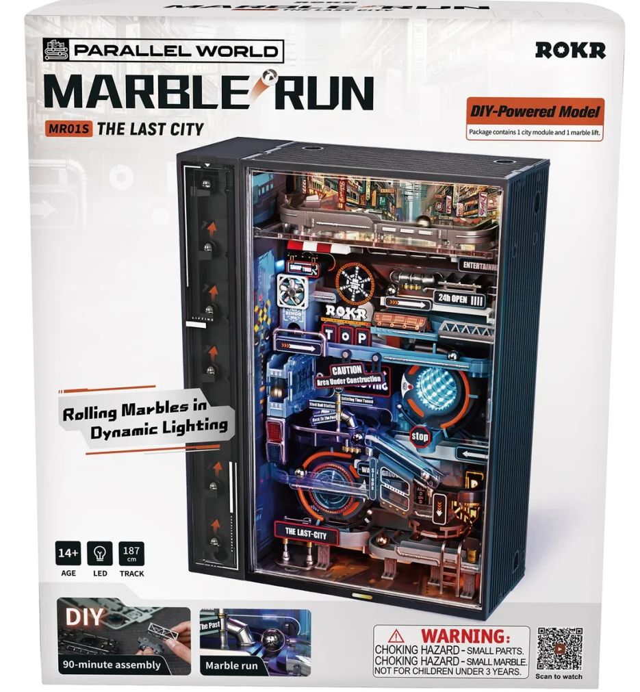 High-rise buildings are built on a backdrop of pipelines, factories, and sharp bends, bearing witness to the frantic chase embarked by multiple speeding marbles.