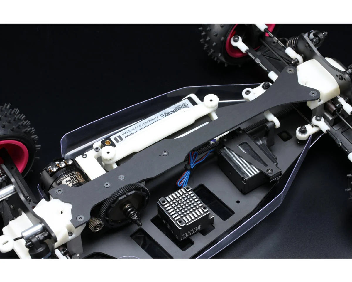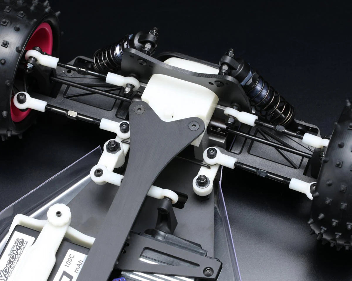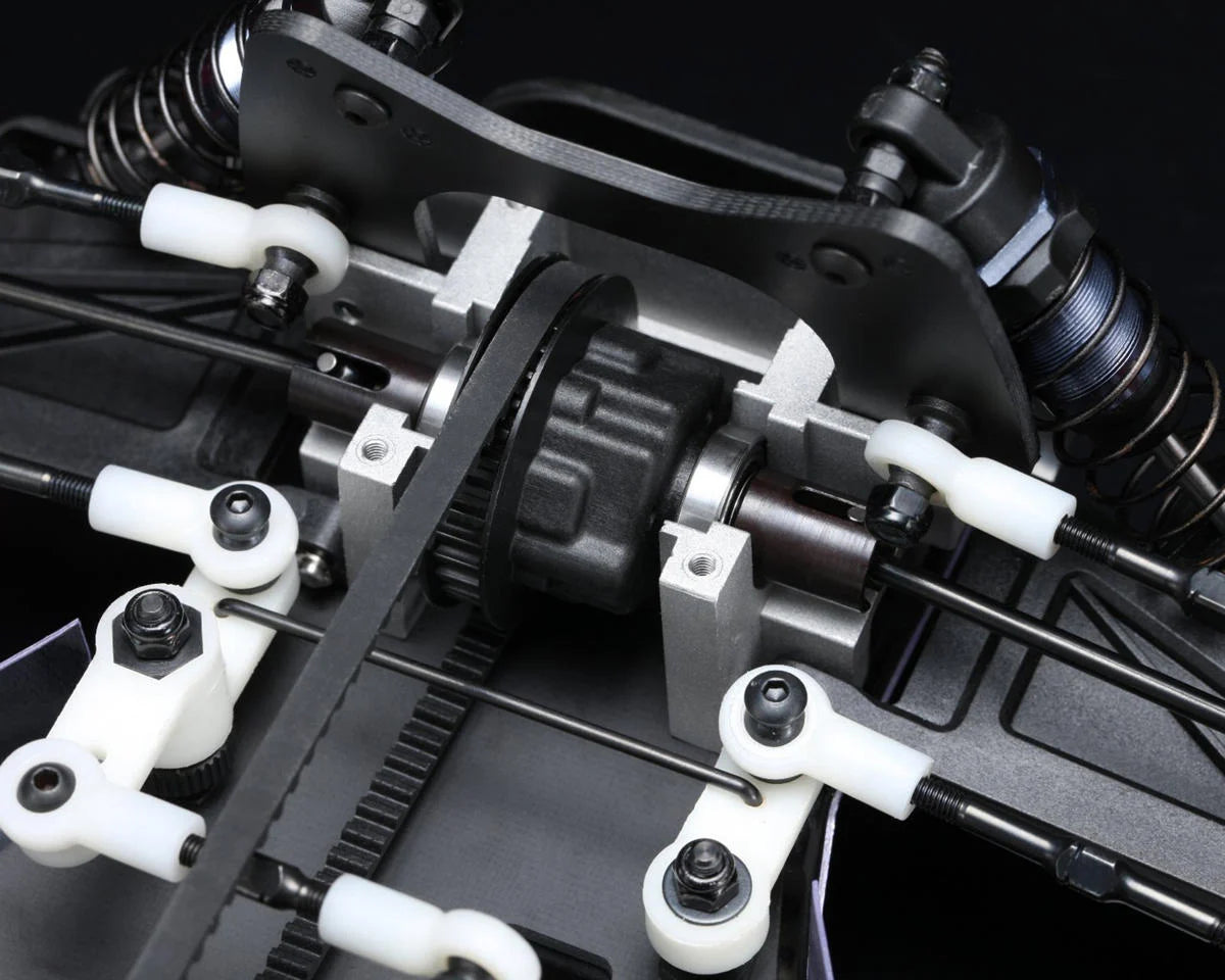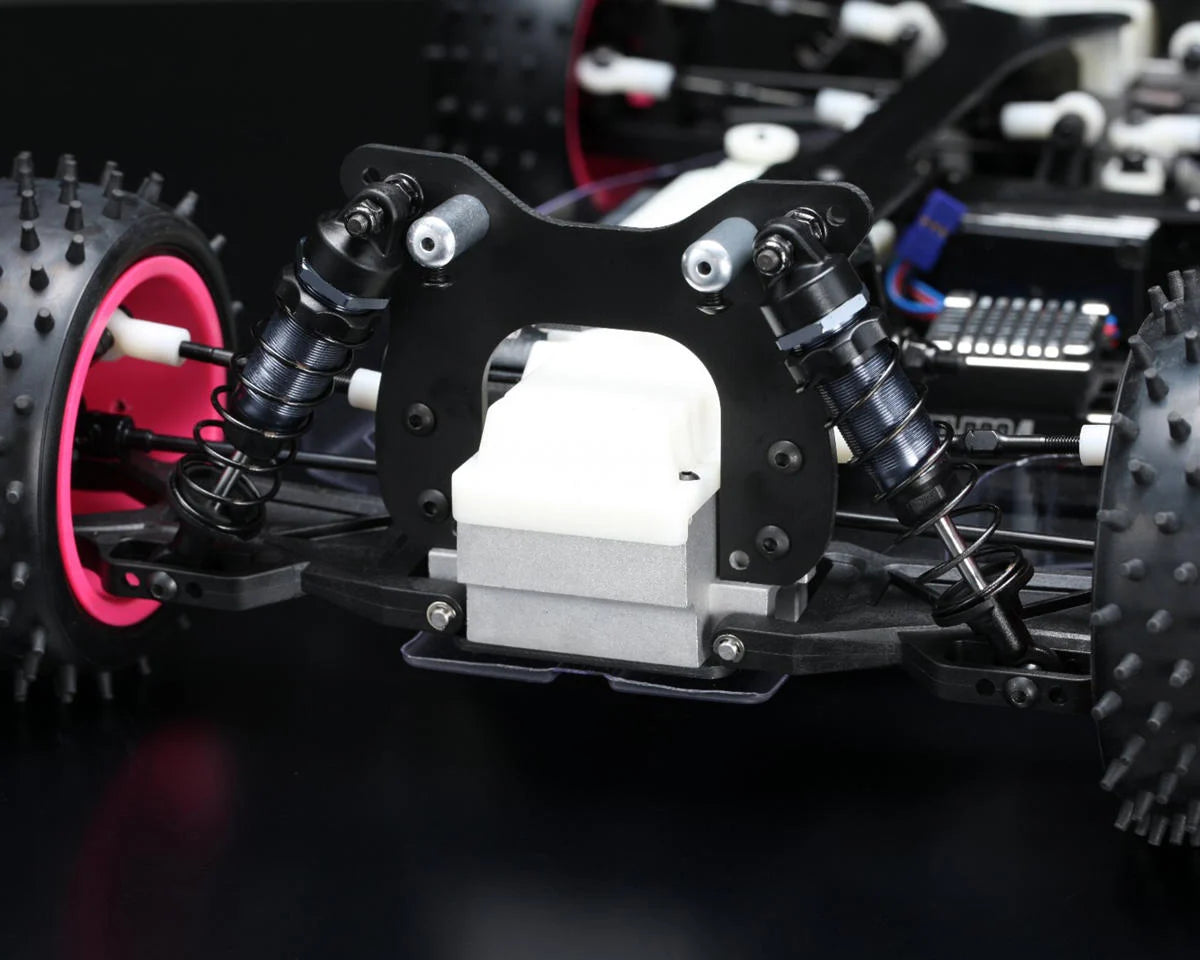 The buggy features a robust FRP double-deck chassis that significantly improves rigidity and stability. By lowering the center of gravity, this design enhances the machine's handling and response on the track. The use of long suspension arms further boosts stability and durability during high-speed runs and jumps, ensuring consistent performance in various conditions. This chassis structure also reduces flex, providing a solid platform for high-torque applications and ensuring the model's durability during competitive racing. The carefully engineered design allows racers to take sharp turns and navigate uneven terrains with confidence and precision.