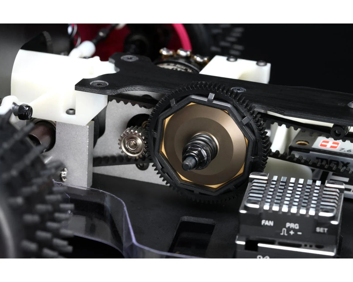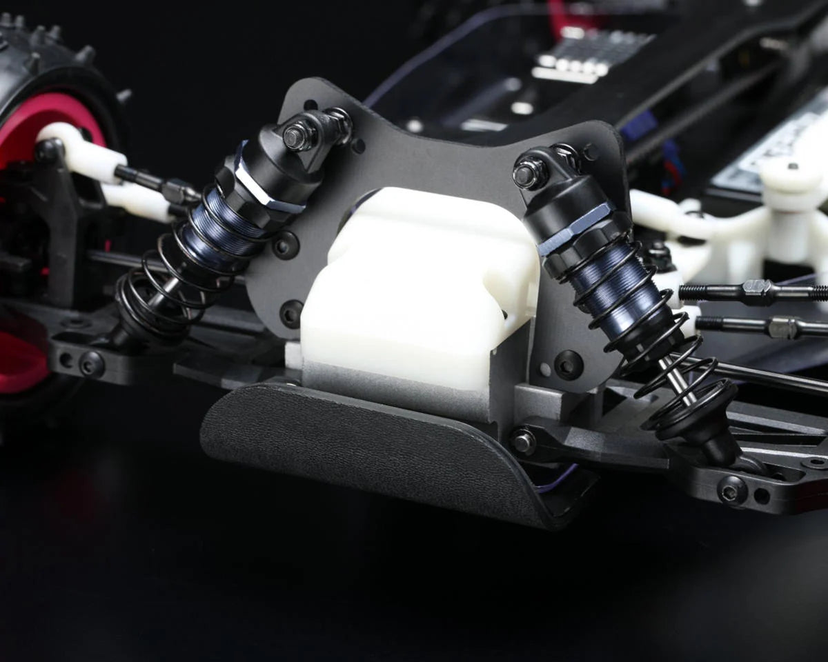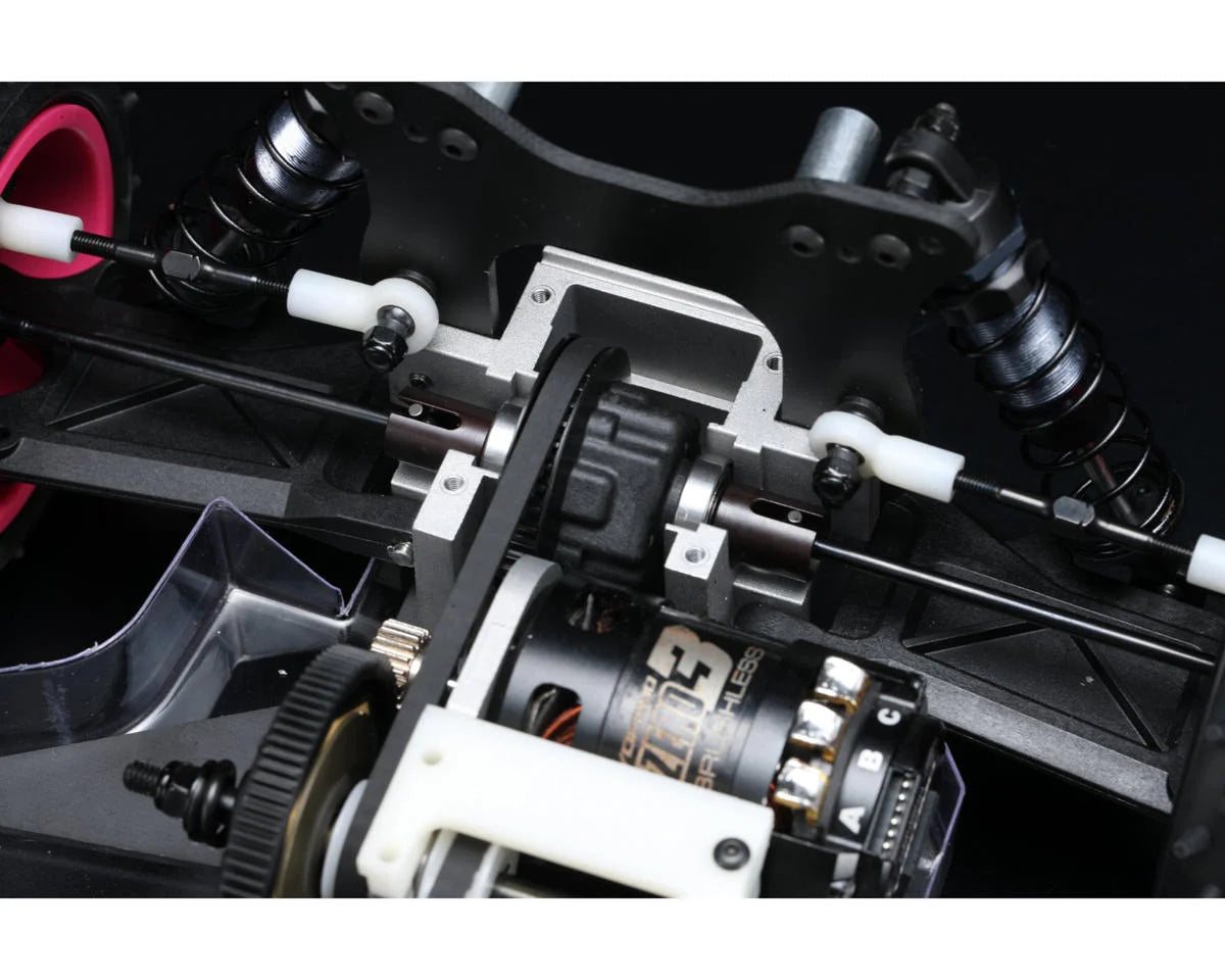 The buggy features a robust FRP double-deck chassis that significantly improves rigidity and stability. By lowering the center of gravity, this design enhances the machine's handling and response on the track. The use of long suspension arms further boosts stability and durability during high-speed runs and jumps, ensuring consistent performance in various conditions. This chassis structure also reduces flex, providing a solid platform for high-torque applications and ensuring the model's durability during competitive racing. The carefully engineered design allows racers to take sharp turns and navigate uneven terrains with confidence and precision.