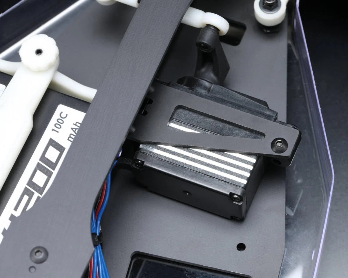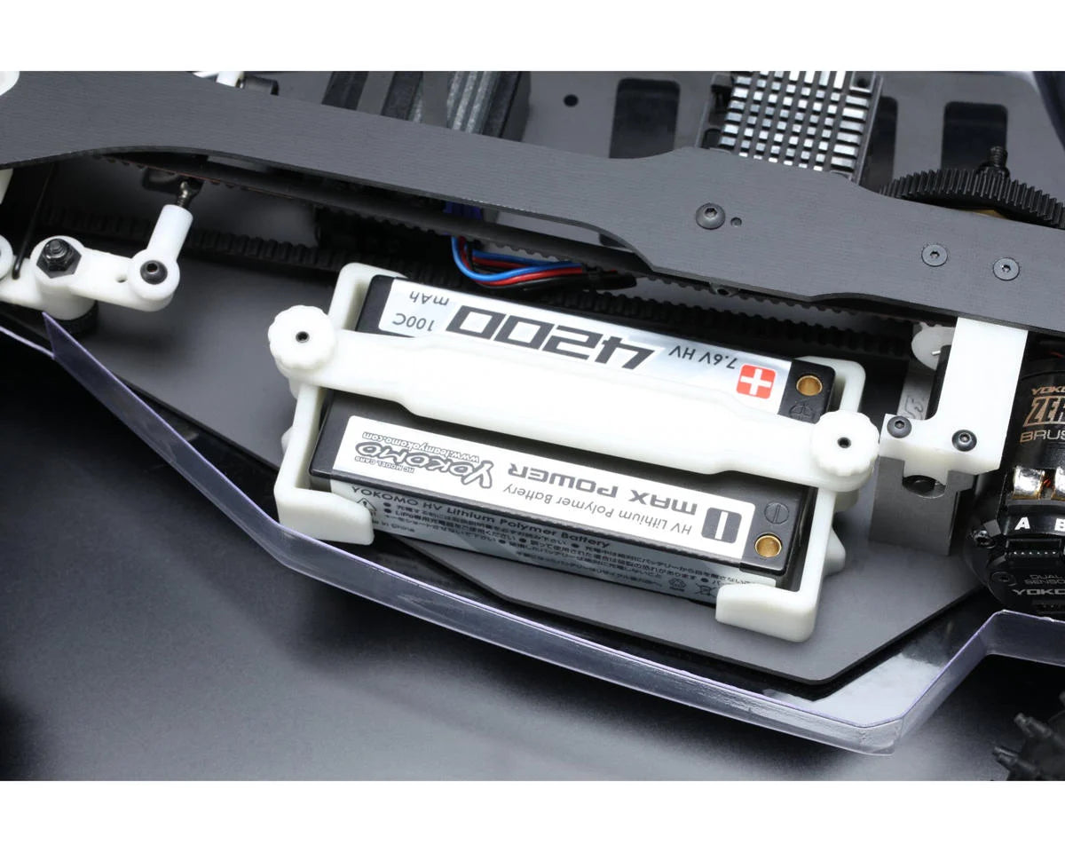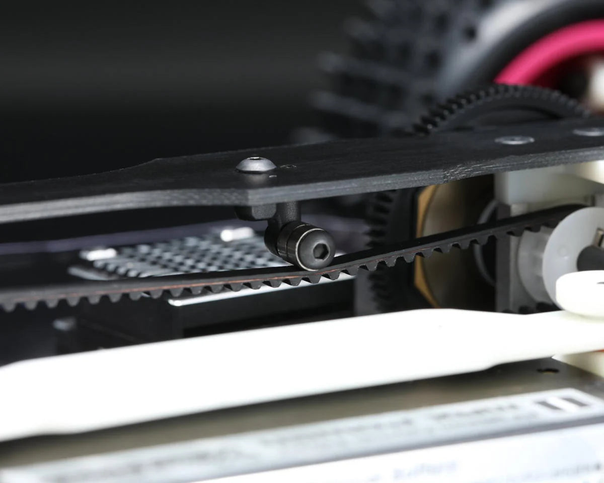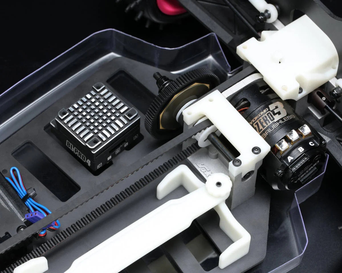 The buggy features a robust FRP double-deck chassis that significantly improves rigidity and stability. By lowering the center of gravity, this design enhances the machine's handling and response on the track. The use of long suspension arms further boosts stability and durability during high-speed runs and jumps, ensuring consistent performance in various conditions. This chassis structure also reduces flex, providing a solid platform for high-torque applications and ensuring the model's durability during competitive racing. The carefully engineered design allows racers to take sharp turns and navigate uneven terrains with confidence and precision.
