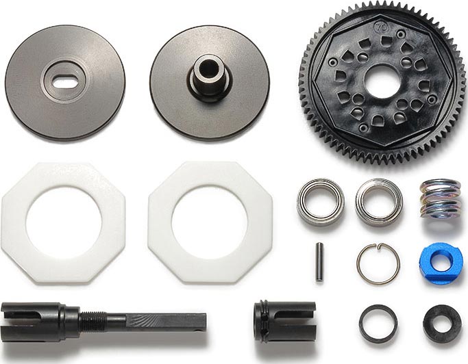 • Slipper Plate A & B x1 each • Slipper Shaft x1 • Slipper Shaft Cup x1 • Slipper Spring x1 • Slipper Nut x1 • Slipper Pads x2 • Spur Gear & Spacer x1 each • 1280 Ball Bearings x2 • 2x9.8mm Stainless Steel Shaft x1 • Axle Ring x1
